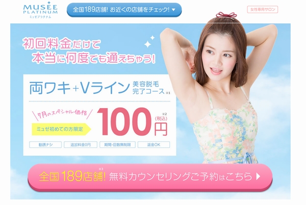 【ミュゼ】7月スペシャル価格!両ワキ+Vライン美容脱毛100円☆全国189店舗![]()